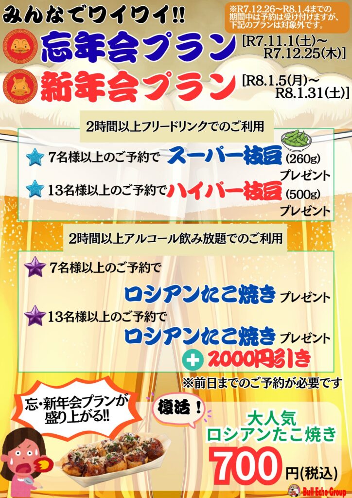 当店ではお得な忘年会・新年会プランをご用意しています!
